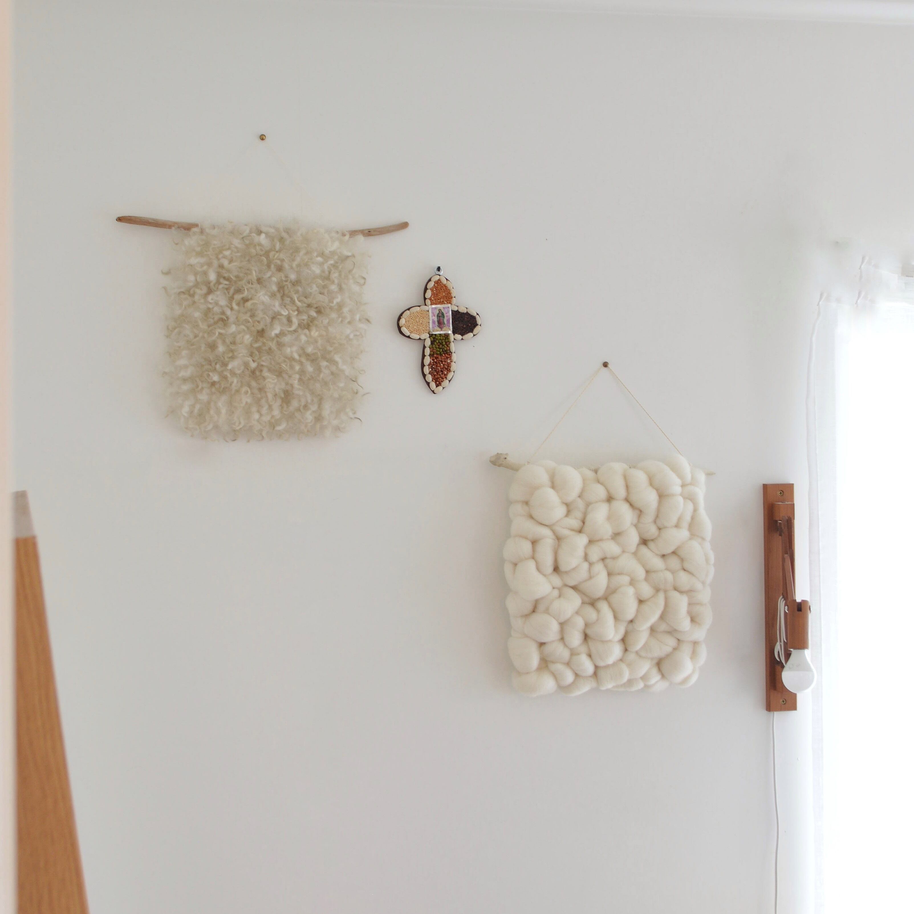 編み目とちょこっと覗く流木が愛嬌のあるタペストリー